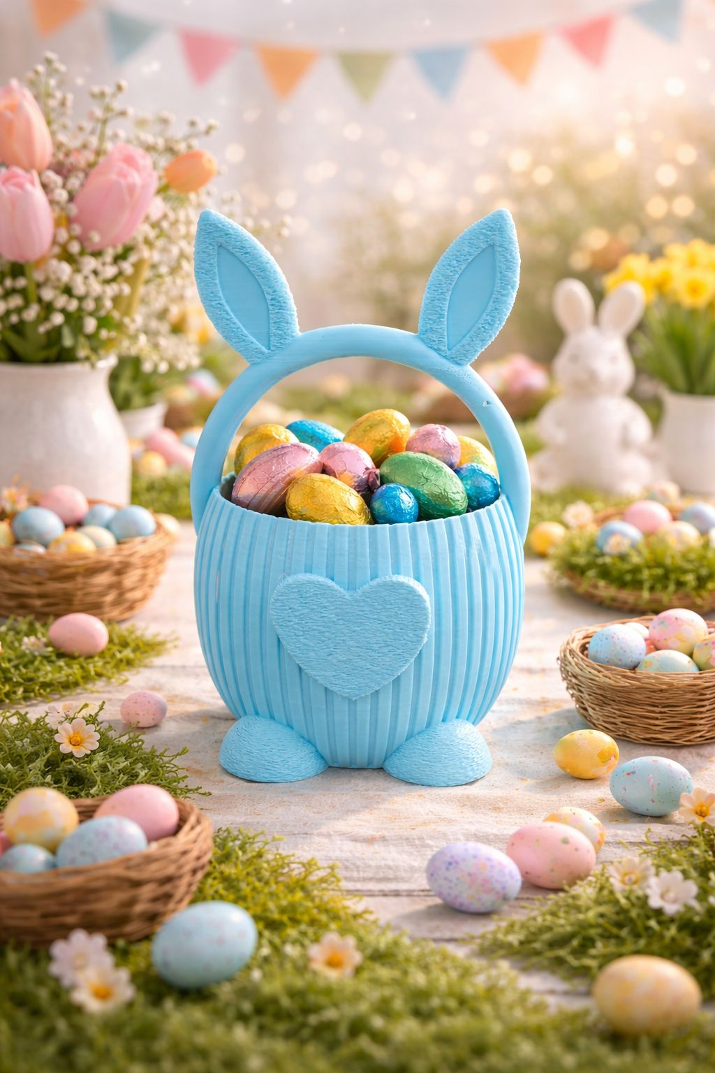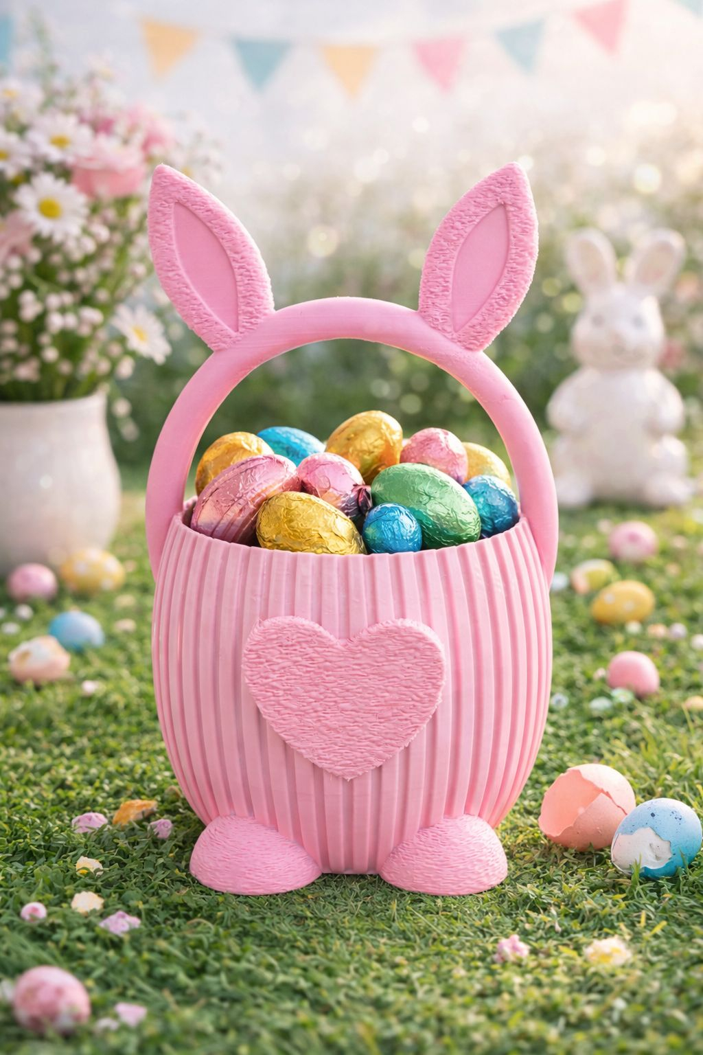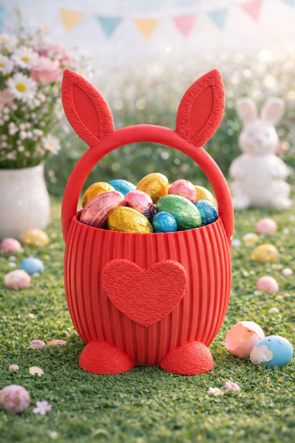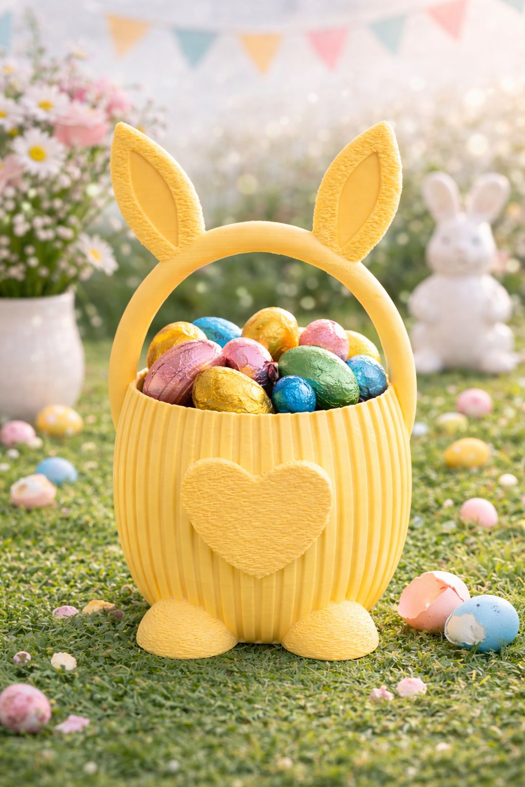 Il poti umple cu oua de ciocolata colorate, dulciuri sau mici surprize festive, transformand fiecare moment intr-o bucurie pentru copii si adulti deopotriva. Forma stabila, textura decorativa si culorile vii il fac ideal atat pentru decorul mesei de Paste, cat si pentru oferirea unui mic dar simbolic.